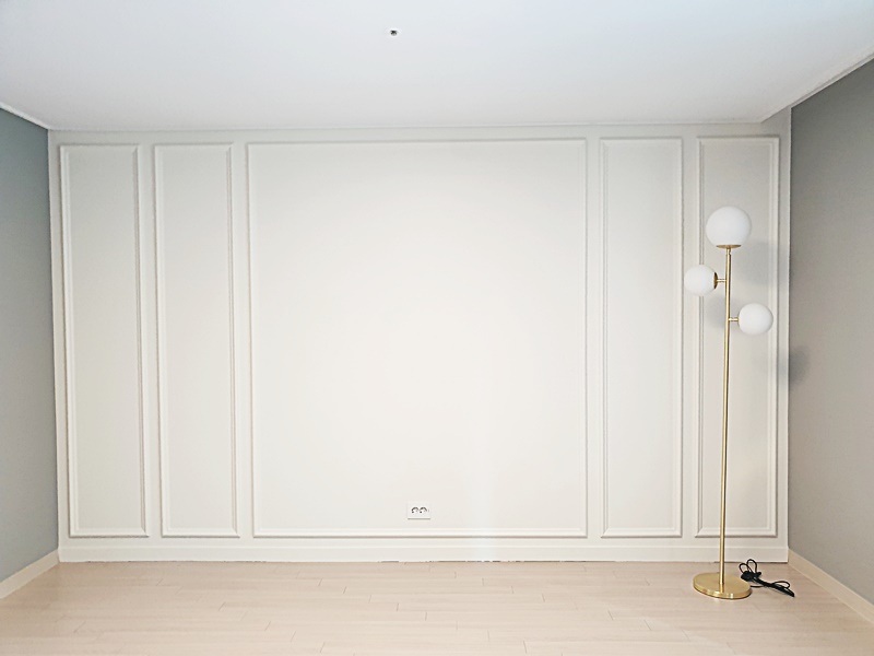 아래 사진은 세종 범지기마을 50평형 아파트 거실 웨인스코팅으로 한쪽면만 시공하였고, 오른쪽 주방벽 일부까지 연장하였다. 기존 벽은 도배로 되어 있었기 때문에 시공순서는 다음과 같다.